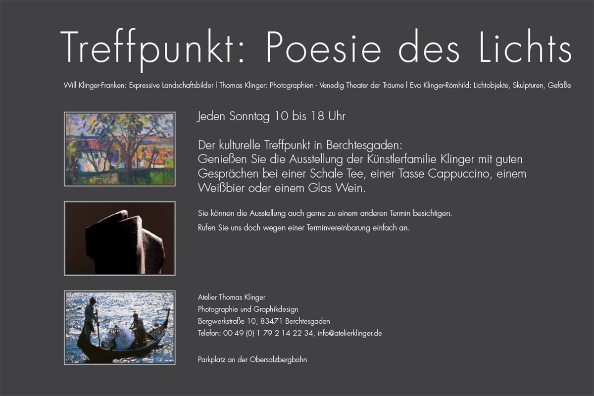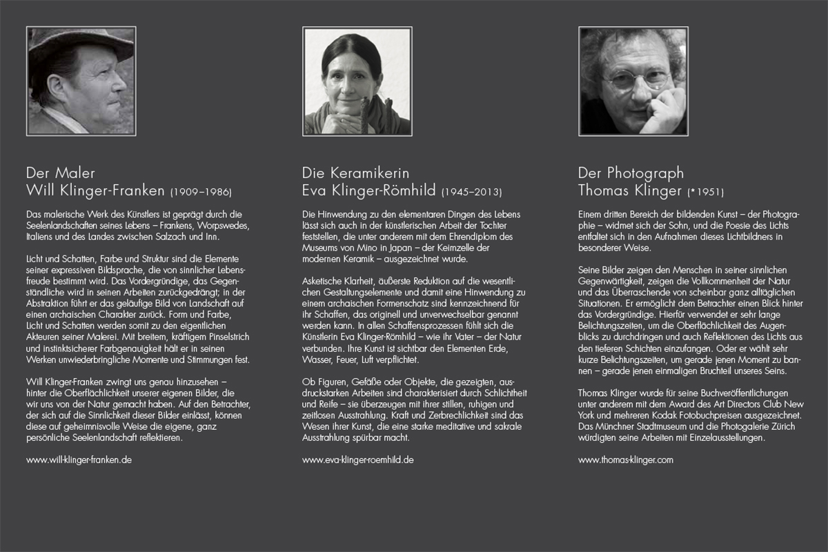 Aber sehen Sie selbst auf den Webseiten Will Klinger-Franken, Eva Klinger-Römhild und Thomas Klinger oder in der Ausstellung »Poesie des Lichts – die Künstlerfamilie Klinger«, die Sie jeden Sonntag von 10 – 18 Uhr oder nach telefonischer Vereinbarung besichtigen können.